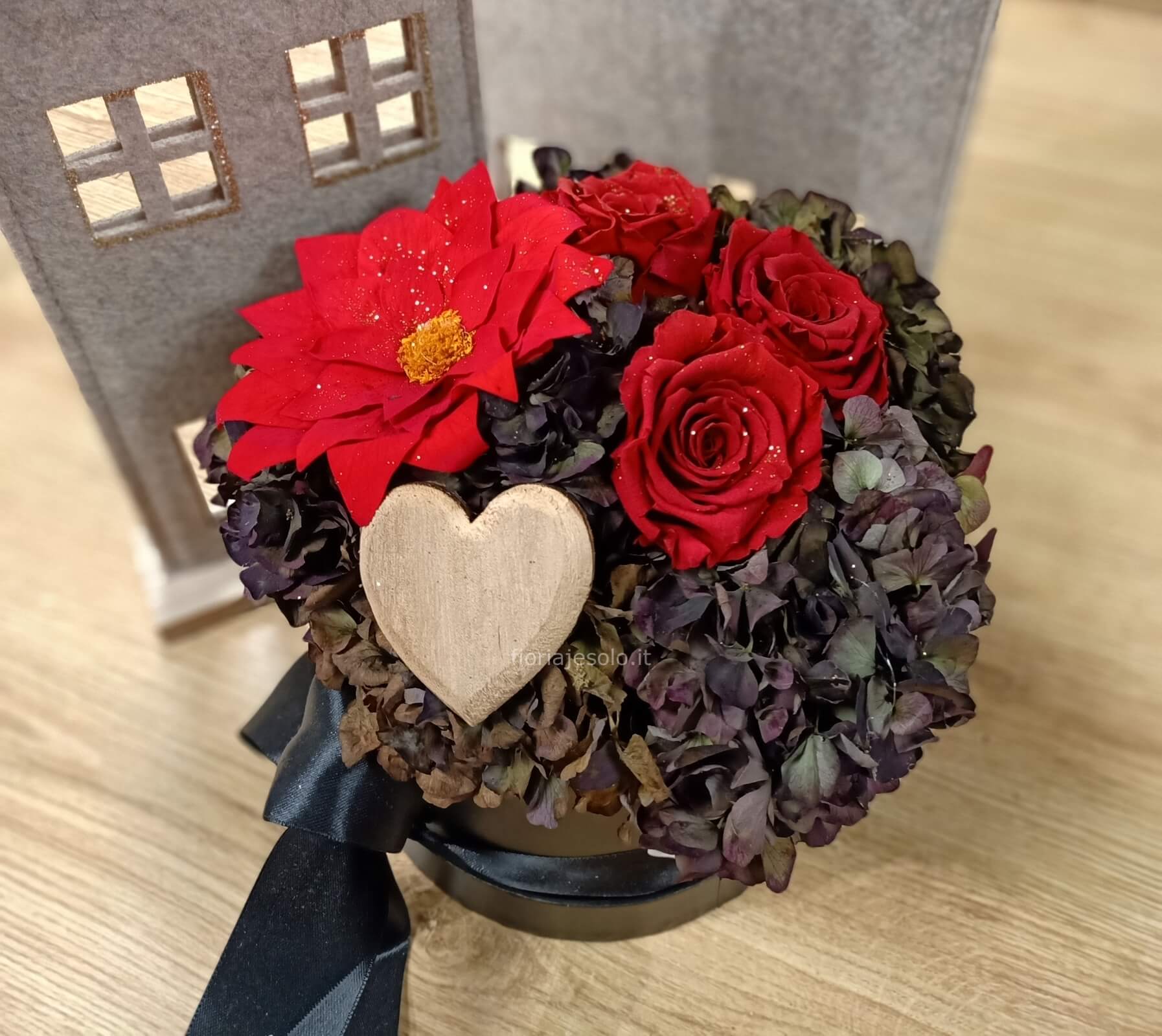Flowerbox con rose e stella di Natale stabilizzata