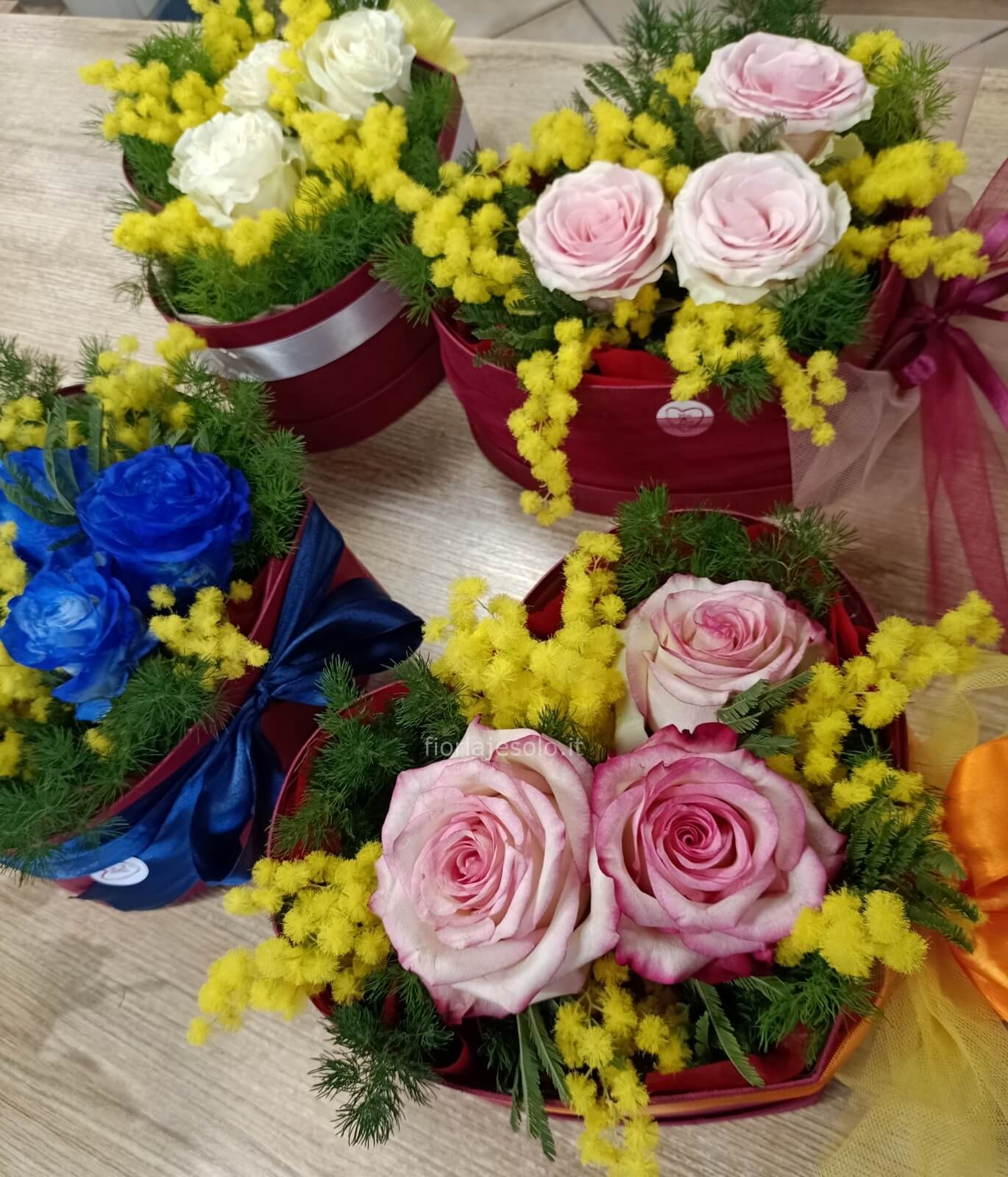 | Heartbox con mimosa e 3 rose con nastro elegante in tonalità di colore Cod. 96307 | € 50,00 | Quantità : | |
