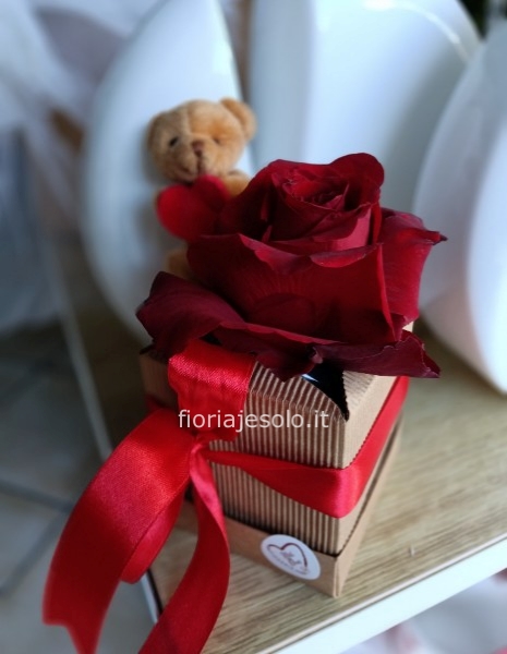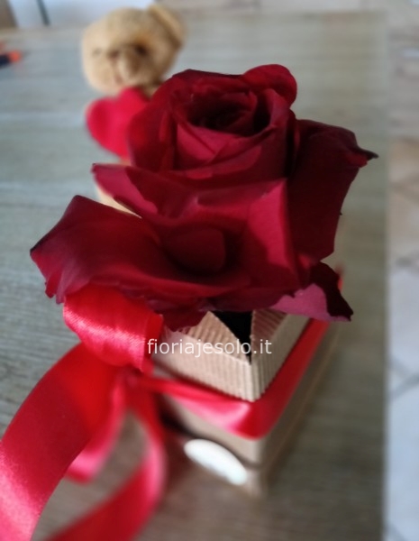 Rosa rossa con orsetto "sprizzamore" in scatolina 8x8xh15
