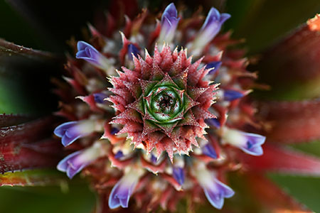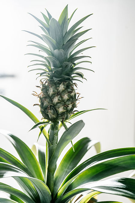 Possiede foglie rigide e carnose, spinose, arcuate e disposte a rosetta con incavo centrale da cui si sviluppa un fusto fiorifero, che porta l'infiorescenza formata da piccoli fiori azzurri e con intorno brattee rosa. In serra produce il frutto dell'ananas dopo alcuni mesi. La pianta muore subito dopo aver prodotto fiori e frutti.