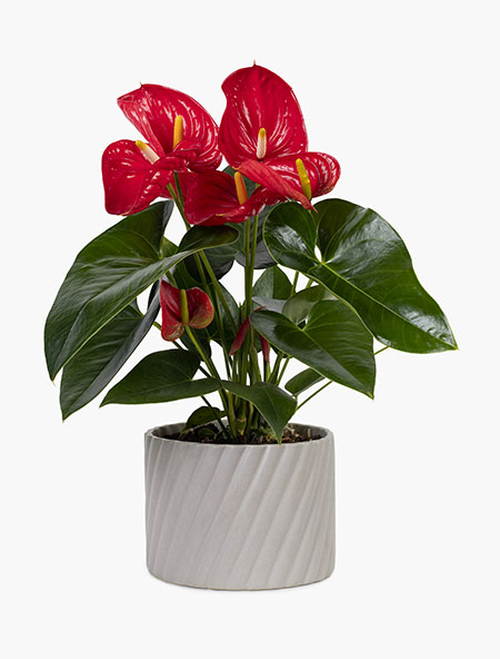 E' pianta originaria dell'America centrale, presenta foglie erette a forma di cuore di colore verde scuro. Sono foglie lucide, grandi, con gambo piccolo ma resistente; sviluppa fiori grandi (spata), di colore rosso corallo all'origine, adesso in molte varieta' di colore e sfumature ottenute attraverso manipolazioni genetiche. Questi fiori sono costituiti da uno spadice e da una spata: lo spadice e' una piccola infiorescenza di colore che va dal verde iniziale al giallo della fase di maturazione, mentre la spata larga, che lo contiene al centro, assume diverse forme e colori ed e' la parte piu' vistosa . Fiorisce anche tutto l'anno, rallenta in estate. Per una nuova fioritura e' necessario tenere la pianta per un breve periodo asciutta e poi dare abbondante acqua, concime e luce.